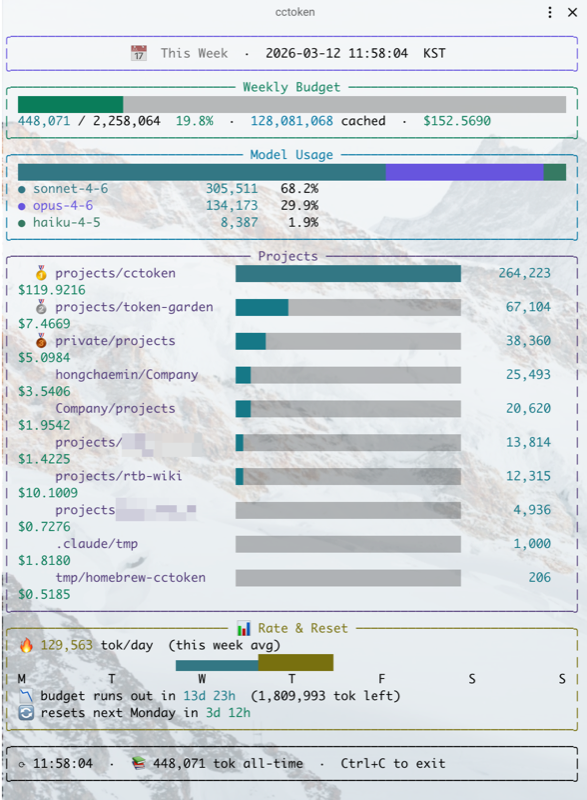Claude Code의 Max plan이든 팀 플랜이든, 토큰에는 한도가 있다. cctoken은 월간 예산을 설정하면 기간별로 비례 배분된 예산 대비 현재 사용량을 프로그레스 바로 보여준다. 초록 → 노랑 → 빨강으로 색이 변하니, 감각적으로 "아, 좀 아껴 써야겠다"를 느낄 수 있다.